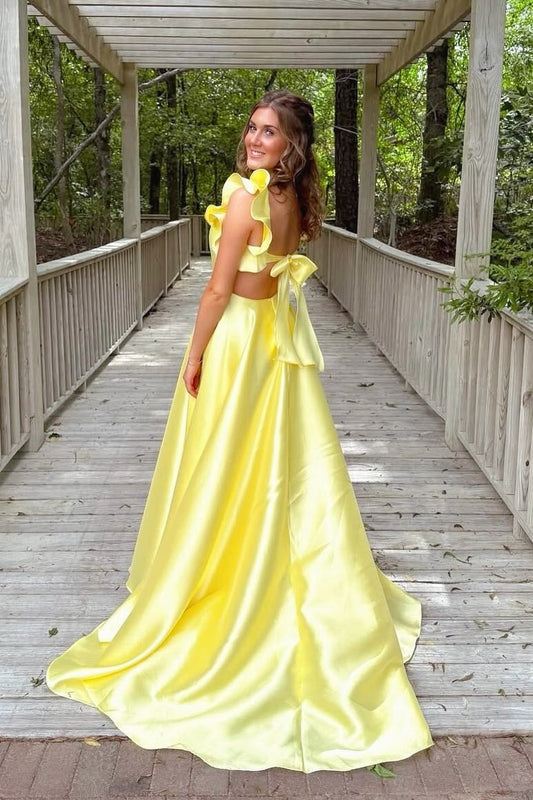Square Neckline Yellow Satin A-line Long Prom Dress