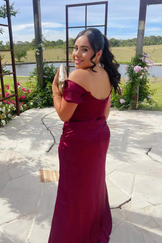 Burgundy Off-the-shoulder Side Slit Long Prom Dress