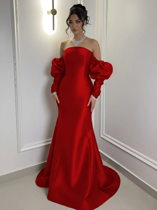 Burgundy Satin Strapless Bubble Sleeves Long Mermaid Prom Dress With Pleated