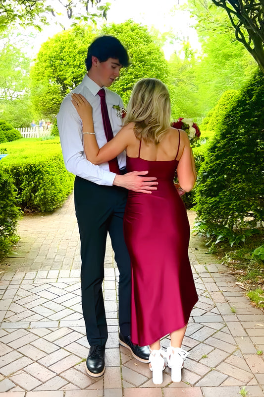 Burgundy Spaghetti Straps Asymmetric Hem Long Dress