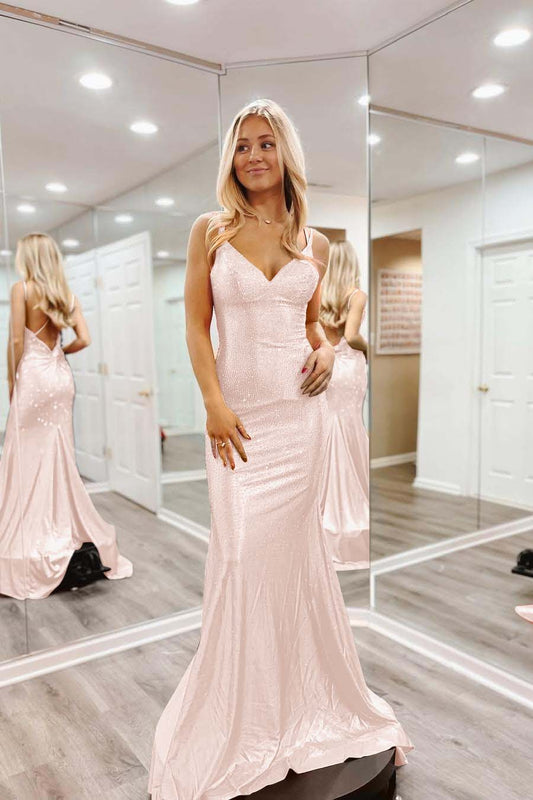 Deep V Neck Sleeveless Mermaid Long Prom Dress Spaghetti Strap With Sequins