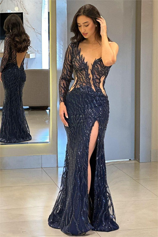 One Shoulder One Long Sleeve Backless Mermaid Split Prom Dress With Appliques