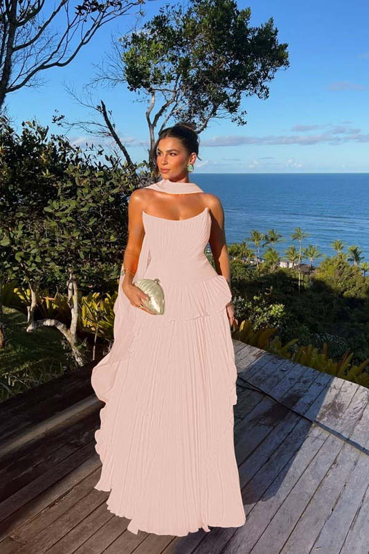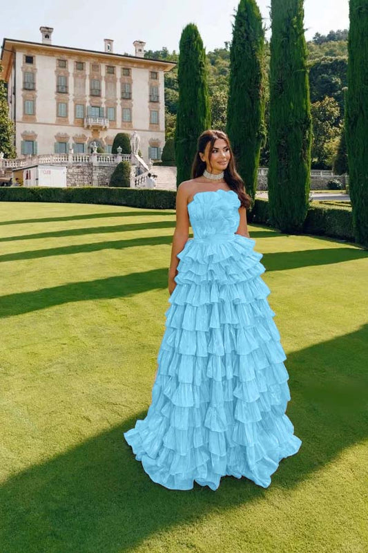 Chiffon Strapless Sleeveless High Waist Long A-Line Prom Dress With Pleated And Ruffles