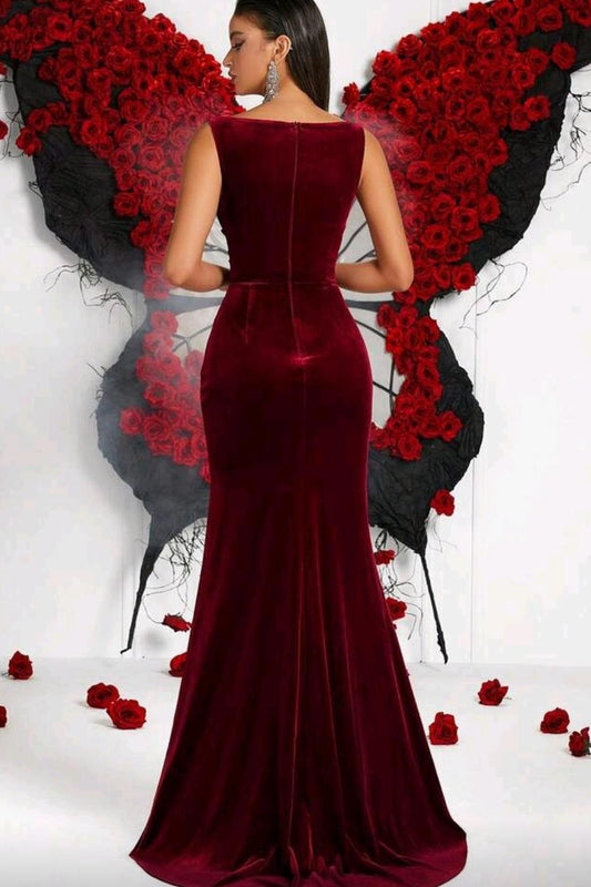 Velvet Round Neck Wide Shoulder Straps Sleeveless Long Mermaid Prom Dress With Split And Pleated