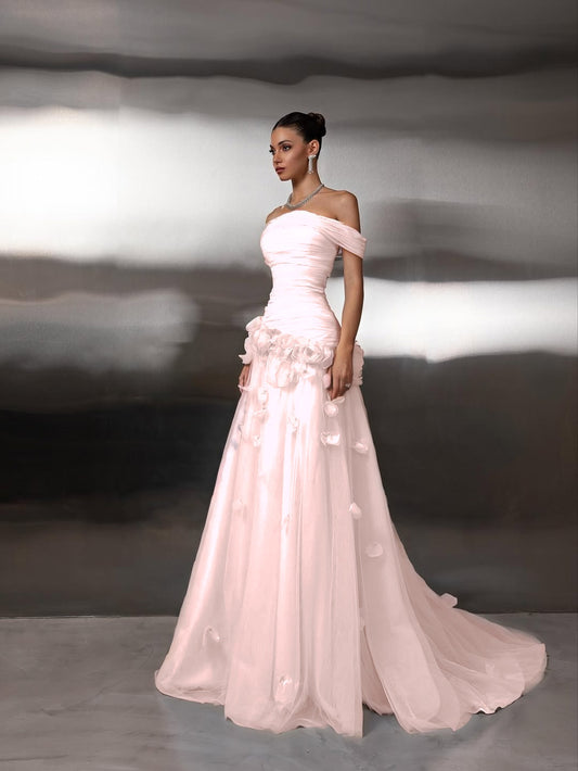 Tulle Off-The-Shoulder Strapless Sleeveless Long Prom Dress With Pleated And Flower Appliqués