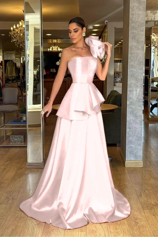 Satin Strapless Sleeveless Long A-Line Prom Dress With Pleated And Flowers