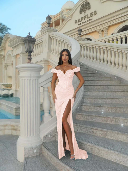 Sweetheart Off-The-Shoulder Sleeveless Long Mermaid Prom Dress With High Split And Sequins