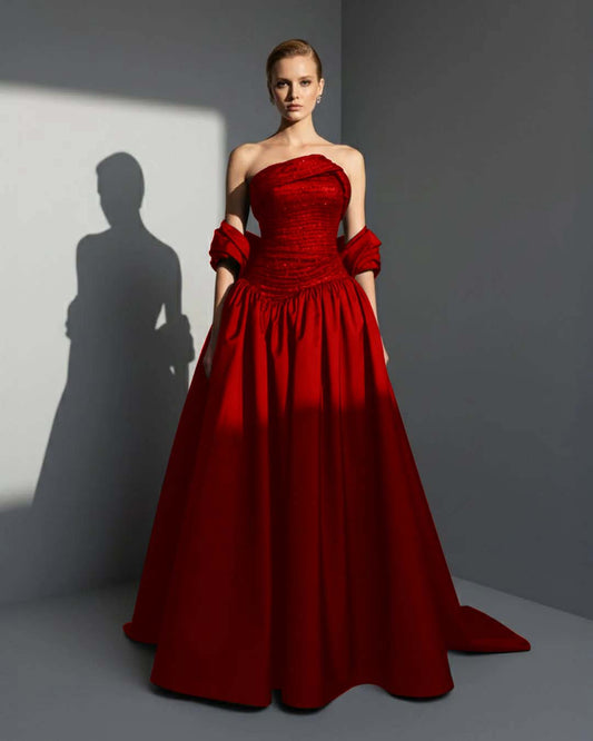 Red Pearl Strapless Prom Dress Long Slit Sleeveless With Beading