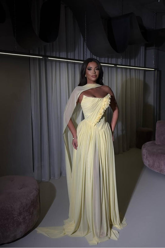 Chiffon Strapless Sleeveless Long Pleated A-Line Prom Dress With Flowers And Ruffles