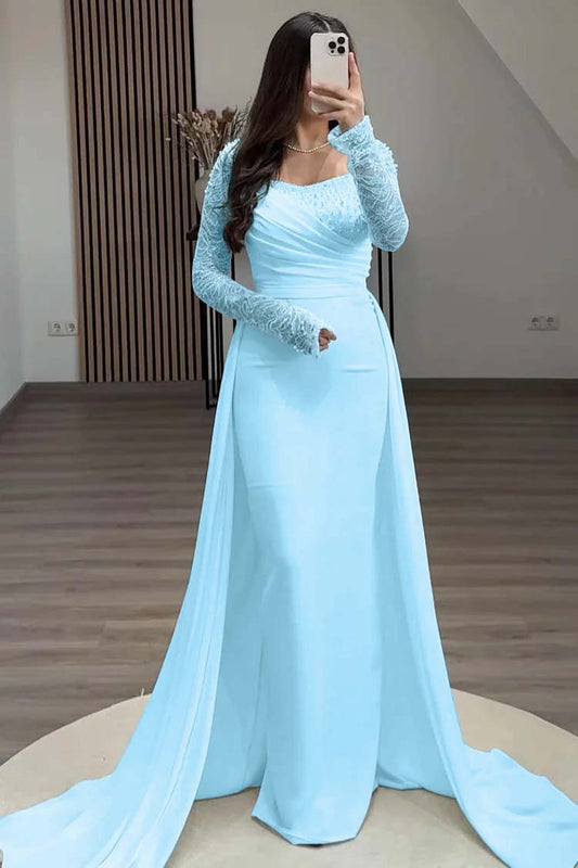 Square Neck Long Sleeves High Waist Long Pleated Mermaid Prom Dress With Beadings And Ruffles