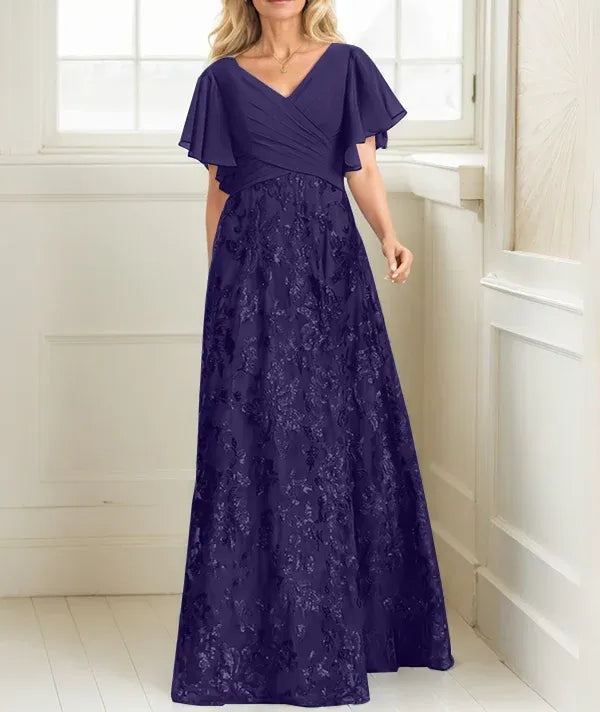 A-line V-Neck Floor-Length Lace Sequin Chiffon Mother of the Bride Dress With Pleated